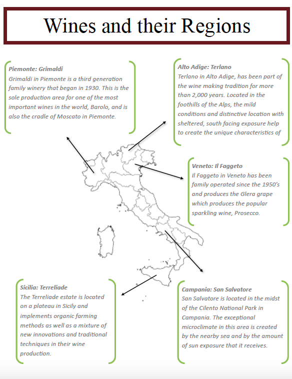 Below is a map of Italy with a description of five wine producers, each from a different region of Italy. We will taste wines from each of these producers on Saturday, May 14 at Sentieri’s Wine Intensive.
