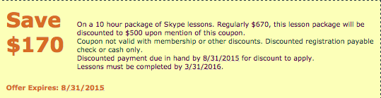 If you sign up for a package of 10 hours of Skype lessons by August 31st, 2015, you will save $170.00 on a 10 hour package of Skype lessons. Regularly $670, this lesson package will be discounted to $500 upon mention of this coupon.
